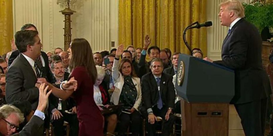 The reporter tried to ask him another question before a female White House aide walked over to him. Trump then told him, “That’s enough!” Acosta continued to try to talk as the intern was seen trying to take the microphone from his hand. She grabbed the microphone but Acosta wouldn’t give it up and there was brief contact between the two. Sanders in a statement — which Acosta later labeled “a lie” — said that “President Trump believes in a free press and expects and welcomes tough questions of him and his Administration.”