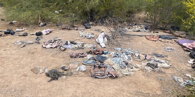 In Pinal County near the town of Stanfield, which is 70 miles north of the U.S. southern border with Mexico, piles of trash and clothing left behind by smugglers can be found just steps away from working farms. Smugglers and the people they bring illegally into the U.S. wear multiple layers of clothing, with the top layer being some kind of camouflage. Once they get through the Tohono O’odham Nation, where border security is severely lacking, smugglers reach a drop point. There, they instruct those they’ve brought into the country illegally to leave the top layer of their clothing — revealing civilian clothing that makes it easier to blend into normal society — and any trash they still have with them. This includes hats, backpacks, pants, jackets, belts, shirts and “carpet shoes,” which are worn over regular shoes and don’t leave trackable footprints. They also drop black water bottles, which they specifically use to evade detection because they do not reflect the sun.